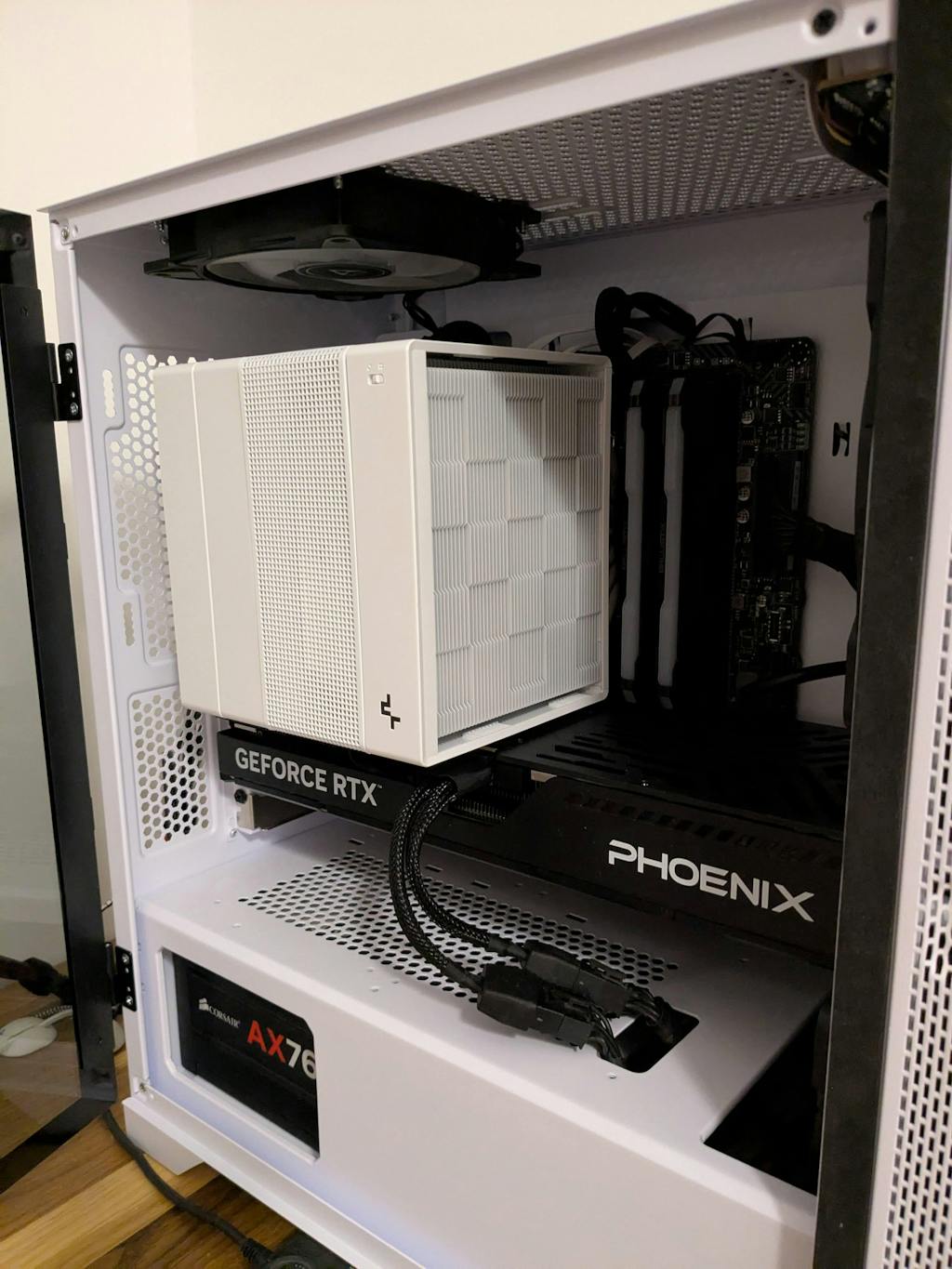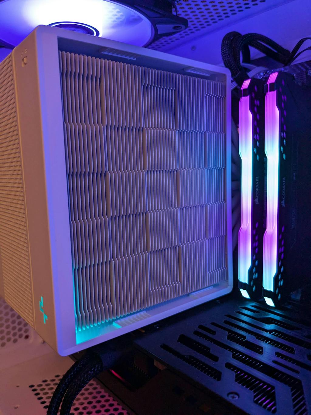 I couldn't be happier. Fits easily in my case, very impressed with the build quality and how the wire routing works - it was easier to install in-situ than I thought thanks to how the centre fan wiring routes underneath. It's quiet enough in performance mode, I haven't bothered with quiet mode because by the time it's making any fan noise at all you can't hear it over the GPU. It's a slightly warmer white than the ice-white of my case, but the RGB negates the difference. Plenty of thermal paste included, enough for several installs I think. I contacted DeepCool to ask if I could retrofit the screen from the VC Vision (you can't, sadly) and they were quick to respond. I love the checker design of the front of the heatsink - it gives me brutalist architecture vibes, like having a concrete monument in my case.